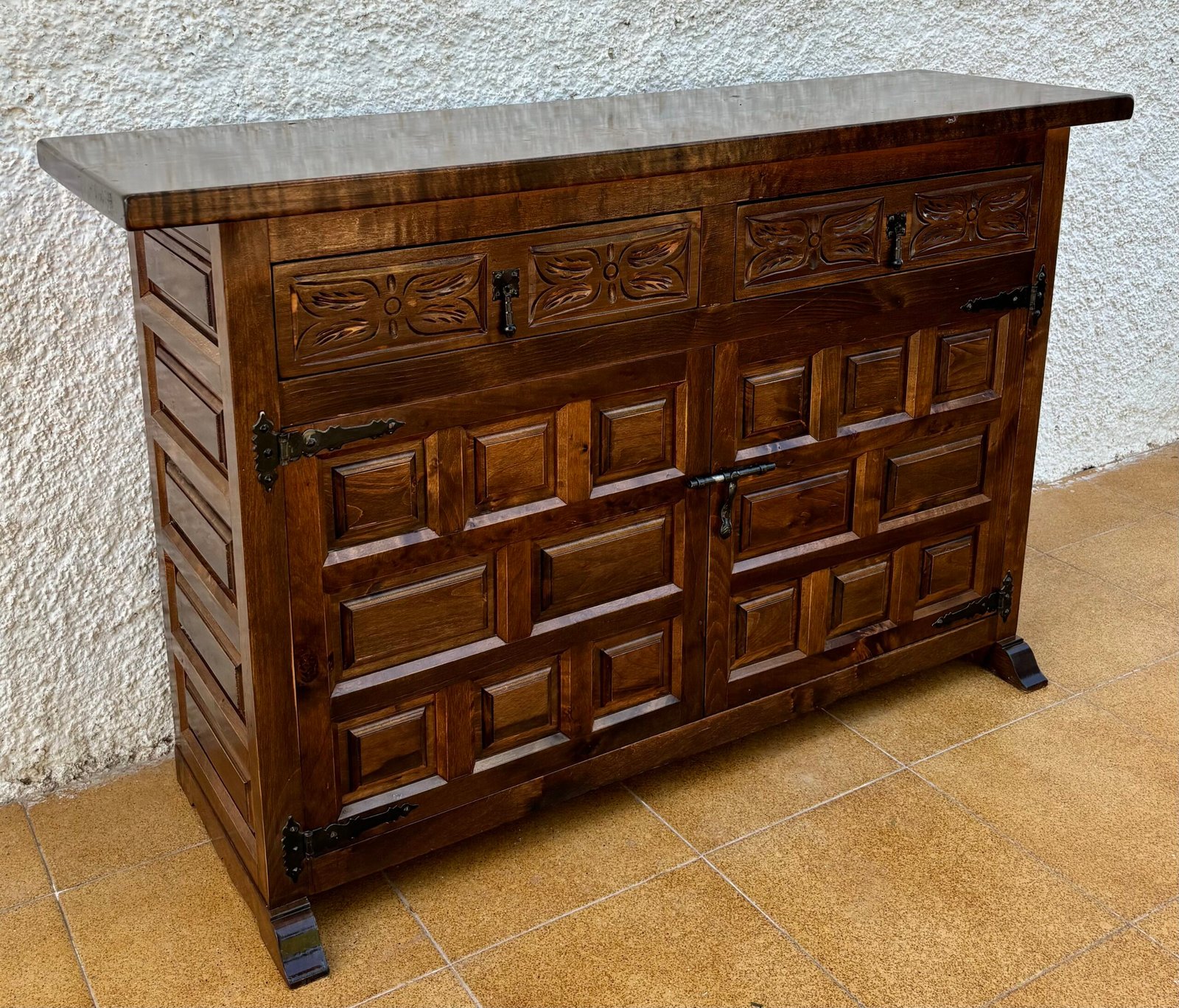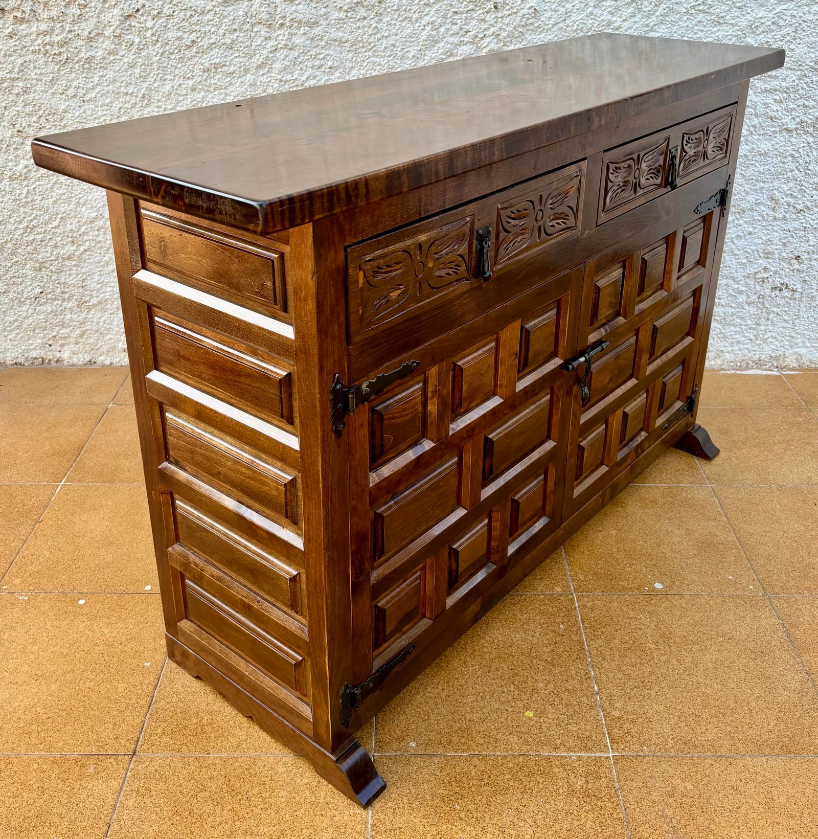 Cómoda, aparador o consola catalana española de nogal tallado, del siglo XX, fabricada en nogal macizo con dos cajones tallados, dos puertas con detalles encantadores y tiradores de hierro fundido, y un gran estante, circa 1920. Estilo colonial español.