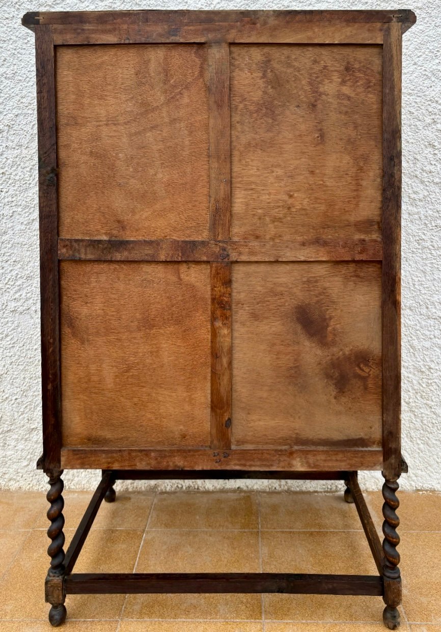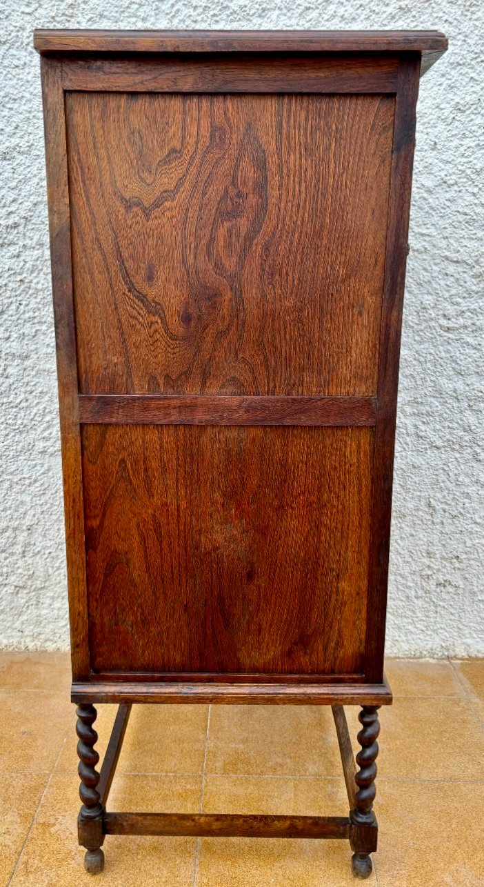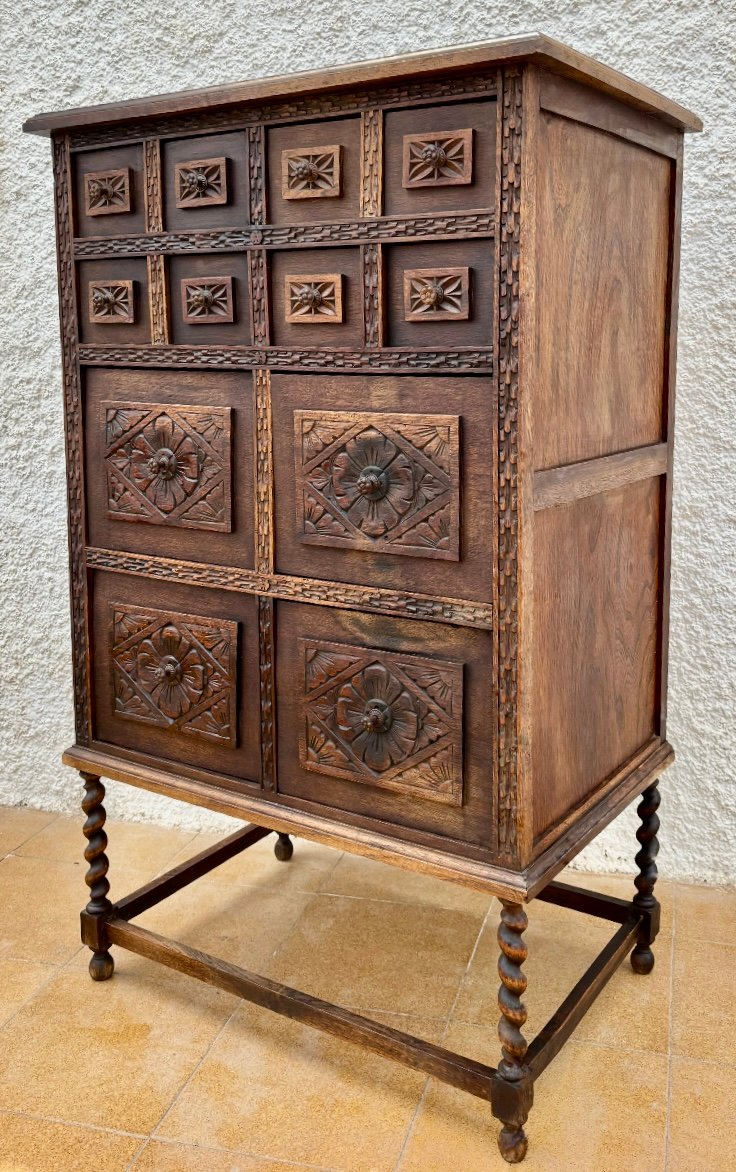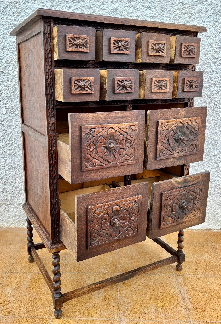 Esta cómoda antigua de madera maciza destaca por sus intrincados relieves florales tallados a mano en cada cajón, aportando un estilo único y artesanal. Su estructura sólida y robusta, junto con las patas torneadas en espiral, reflejan la maestría de la ebanistería tradicional.