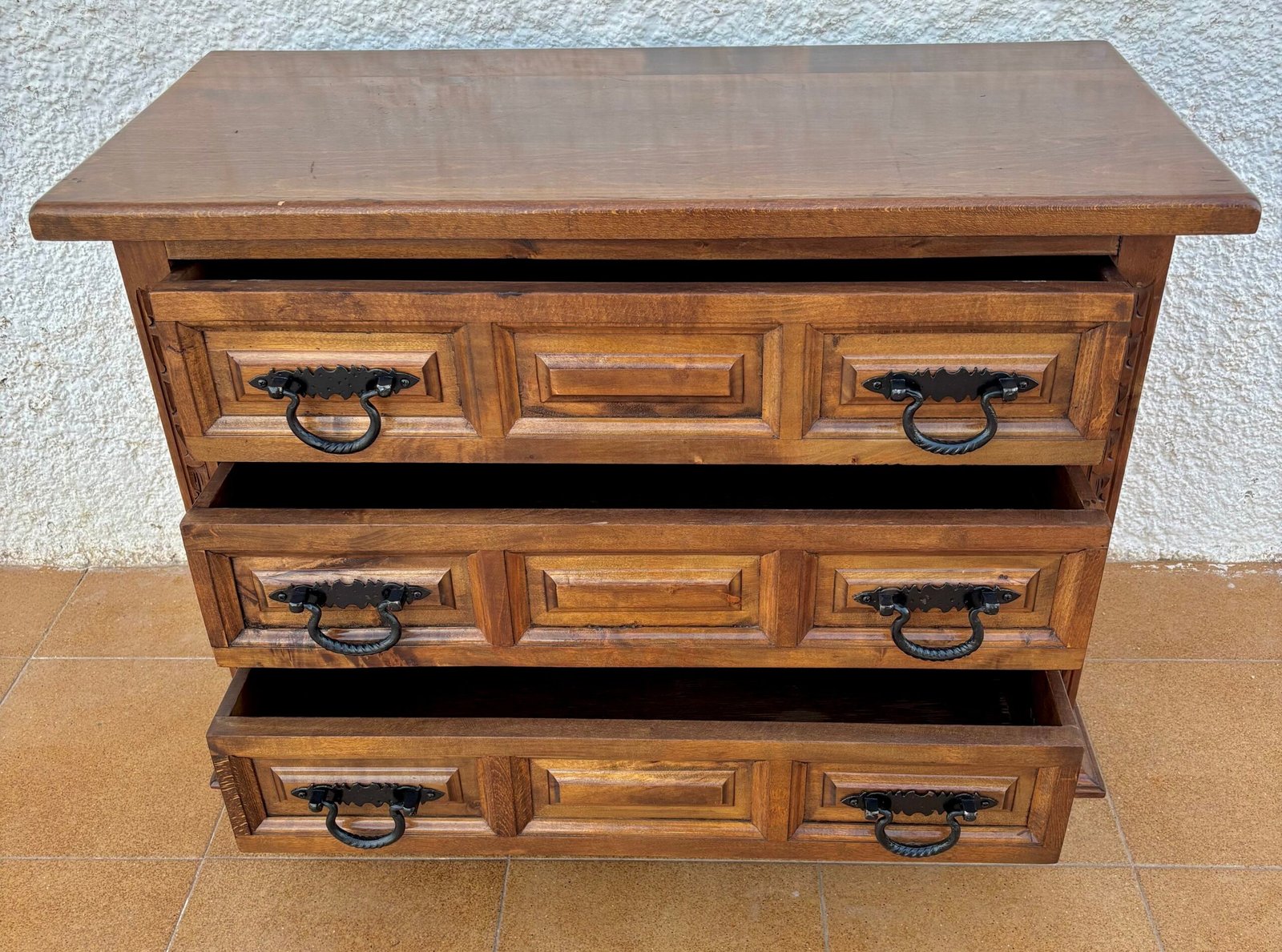 Cómoda castellana de principios del siglo XX. Cuenta con tres grandes cajones de madera de nogal decorados con paneles en el frente y tiradores de hierro. Sus laterales también están decorados con paneles y se apoya sobre cuatro patas redondas.