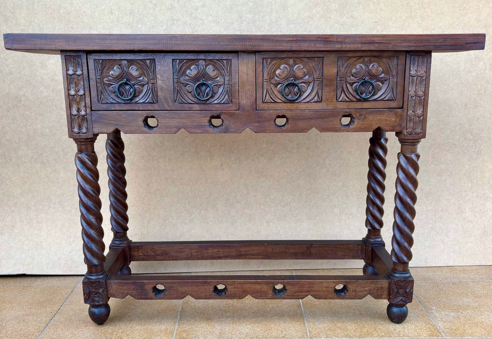 Consola de nogal de principios del siglo XX con tablero plano sobre friso, con dos frentes de cajón decorados con motivos florales tallados e incisos, además de decoración adicional y dos tiradores de hierro originales en cada cajón. La mesa reposa sobre una base tallada a mano con patas salomónicas unidas por dos marcos de madera, uno con motivos florales y el otro con líneas rectas.
