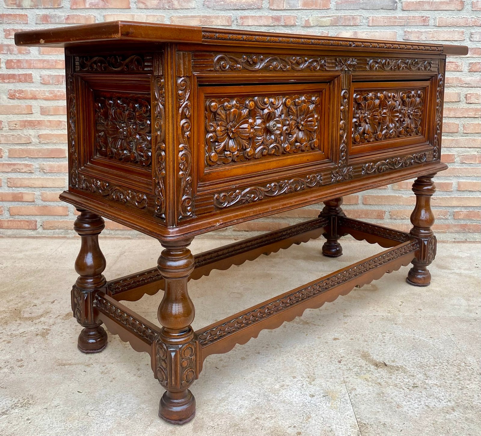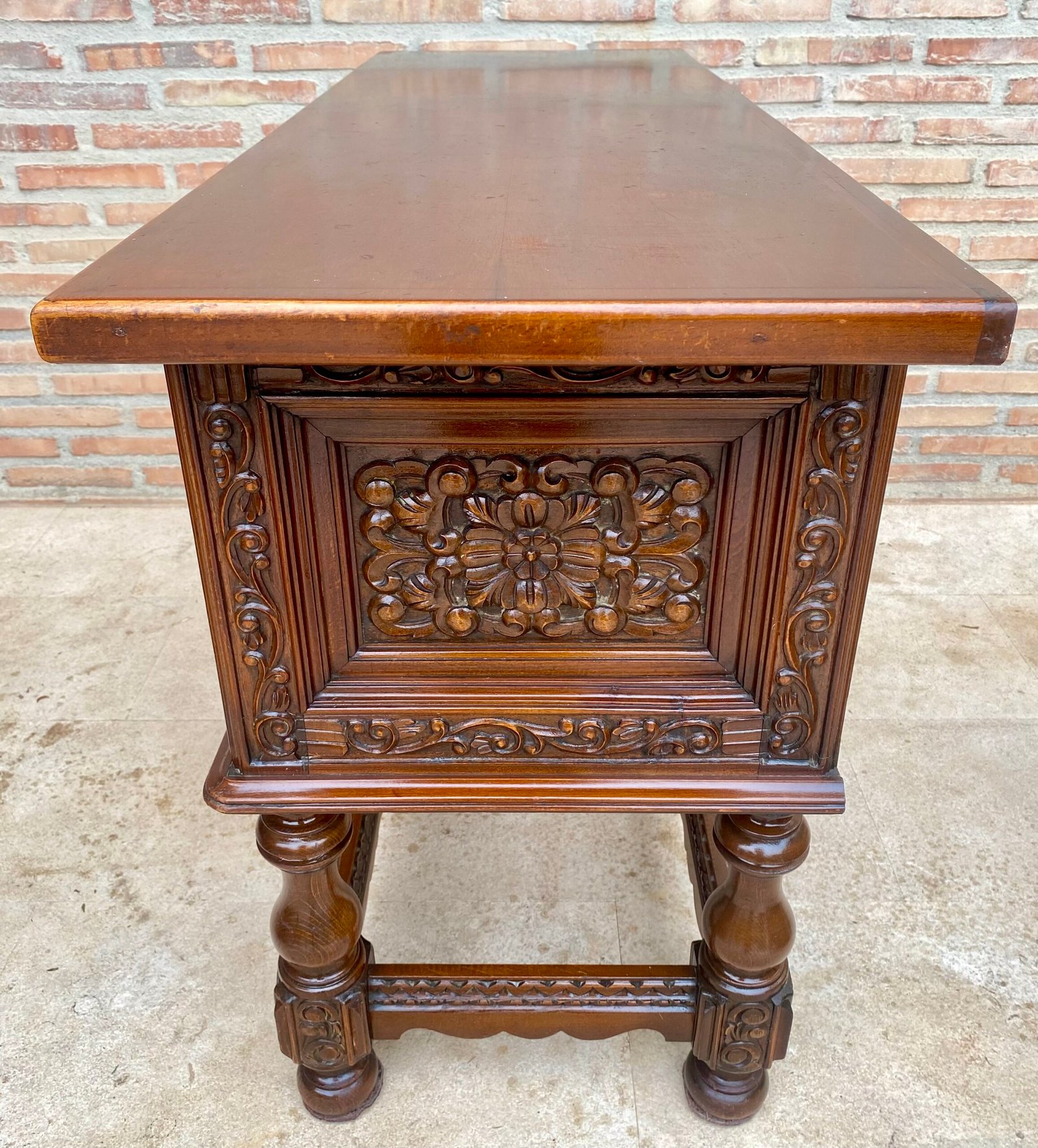 Este gran mueble español de principios del siglo XX presenta una hermosa encimera rectangular de una sola lama sobre cuatro grandes cajones tallados. Cada cajón, con herrajes ligeramente diferentes, está adornado con motivos florales y cada cajón cuenta con sus tiradores colgantes originales hechos a mano. El faldón está adornado con filigranas talladas que se repiten en el extremo de las patas rectas. El conjunto muestra la magnífica presencia de una mesa envejecida con una magnífica pátina y motivos sencillos pero elegantes. El uso de madera de nogal y la pureza de la decoración y las líneas hacen de esta consola española, de alrededor de 1920-1940, un verdadero atractivo para cualquier hogar.