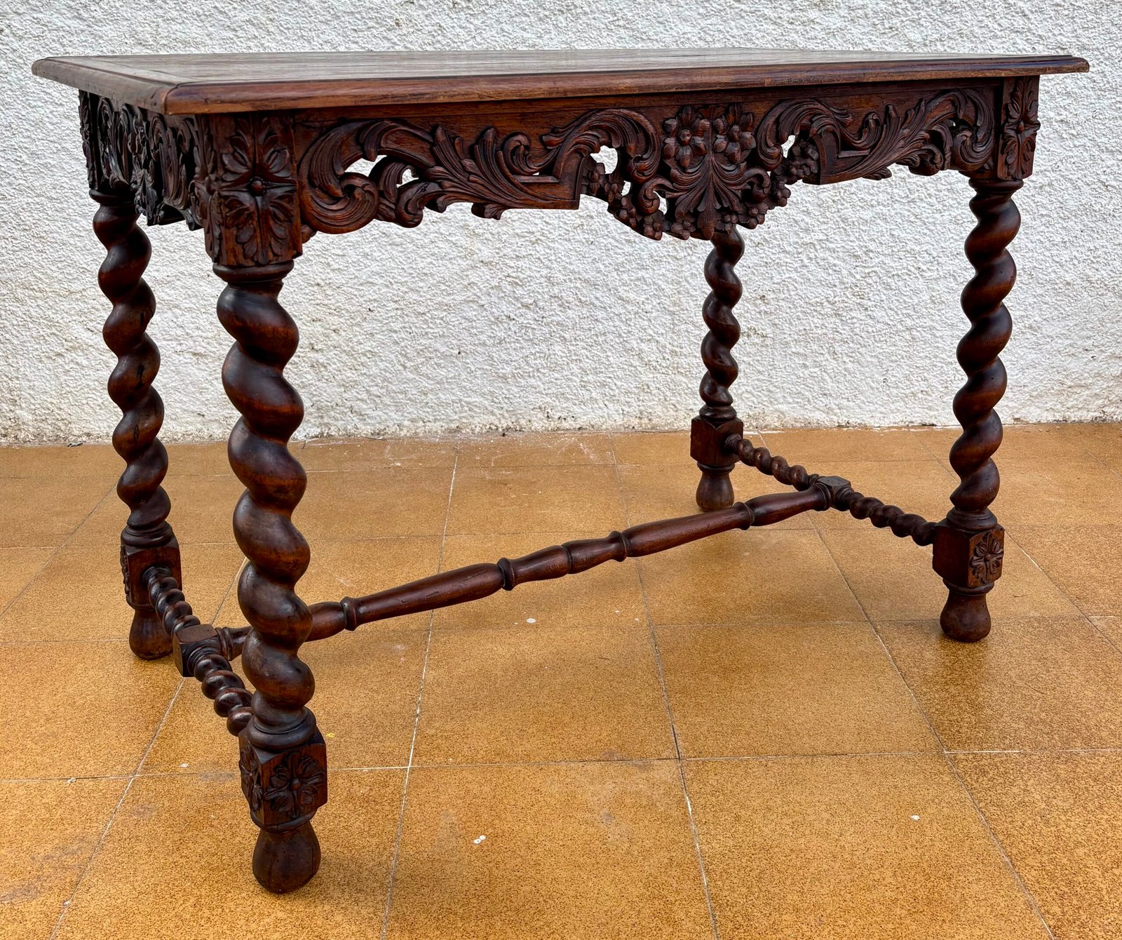 Mesa de sofá o escritorio de roble tallado, estilo Luis XIV, de estilo bretón francés, del siglo XIX. Directamente desde Francia, una mesa de sofá o escritorio de roble antiguo de excelente calidad y con un tallado excepcional. El impresionante faldón presenta festones tallados en todos sus lados, con volutas talladas en la parte inferior y remates centrales. Las cuatro patas torneadas están opulentamente talladas, con juntas de bloque talladas y pies capitoné. Calidad impecable, con bastidores y travesaños tallados a juego. La mesa está tallada y ribeteada por todos sus lados, lo que la hace perfecta para cualquier habitación, ya que no tiene respaldo. Magnífica artesanía, circa 1890.