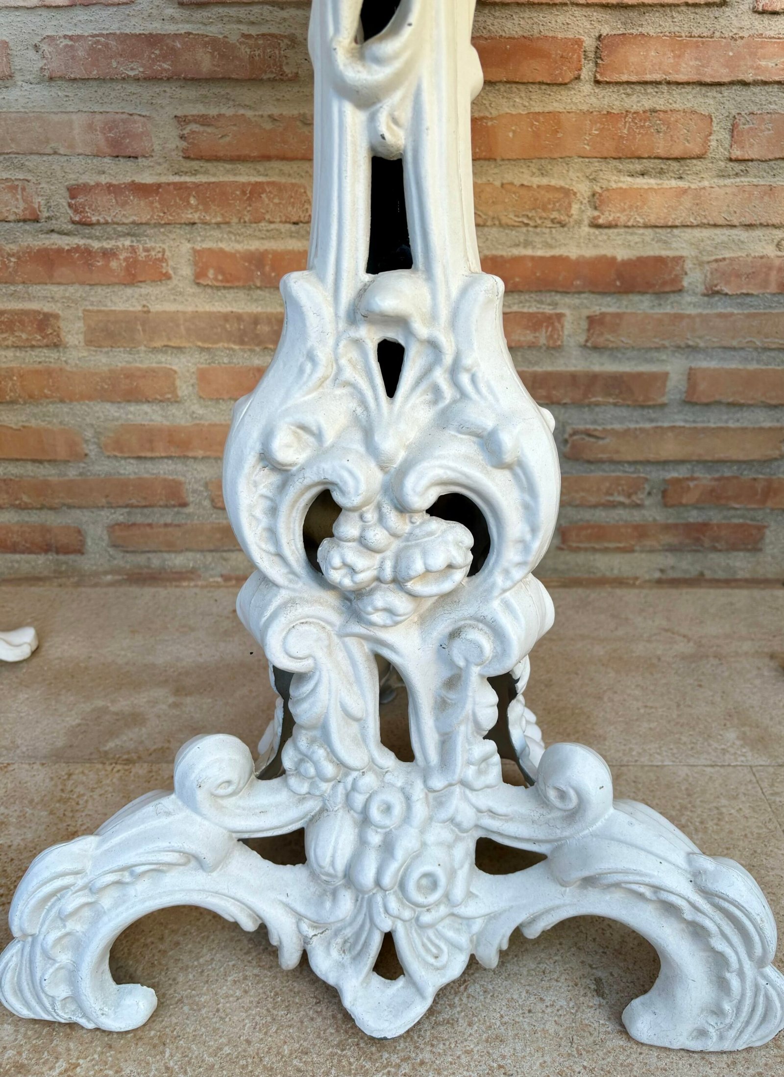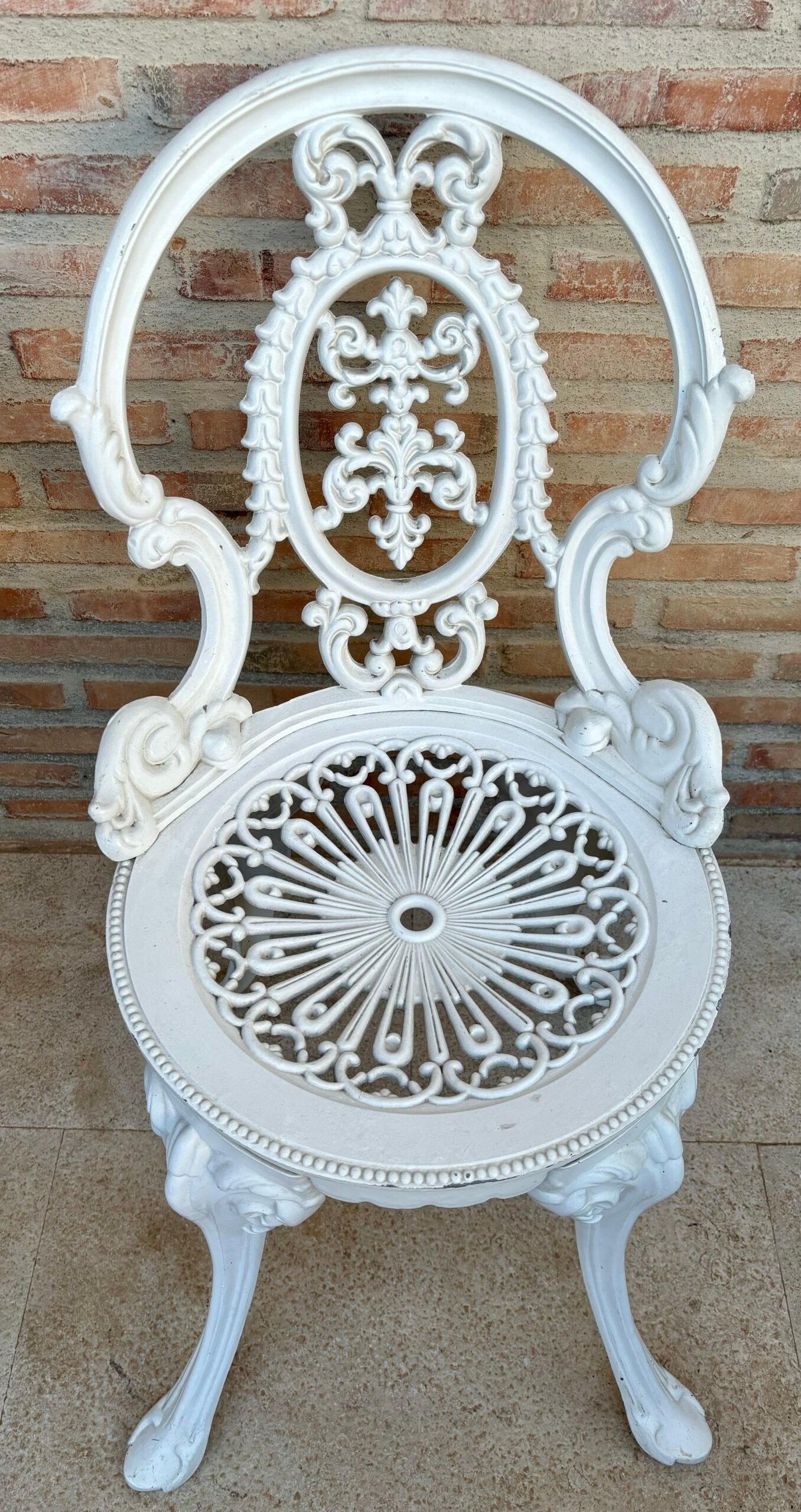 Juego de comedor/patio de tres piezas de hierro forjado. Una mesa con tablero de hierro tallado y dos sillas. Pintado en blanco.