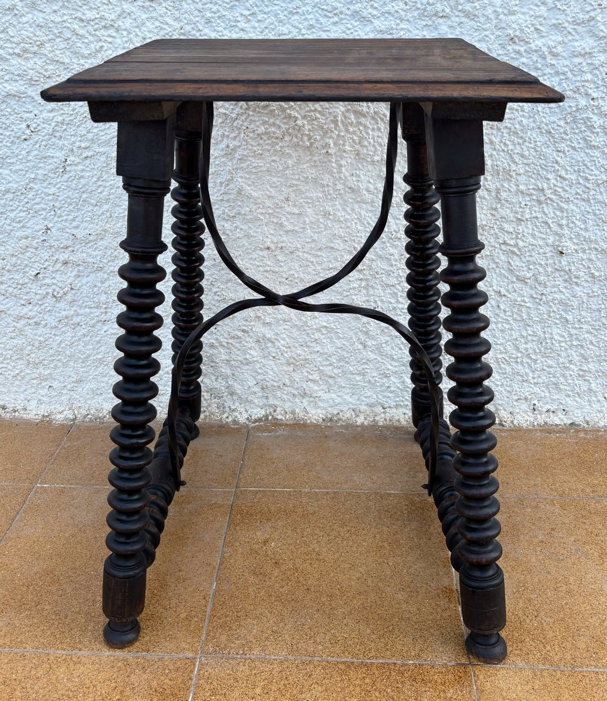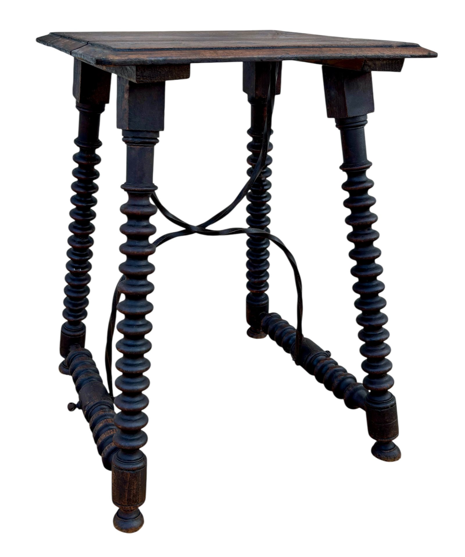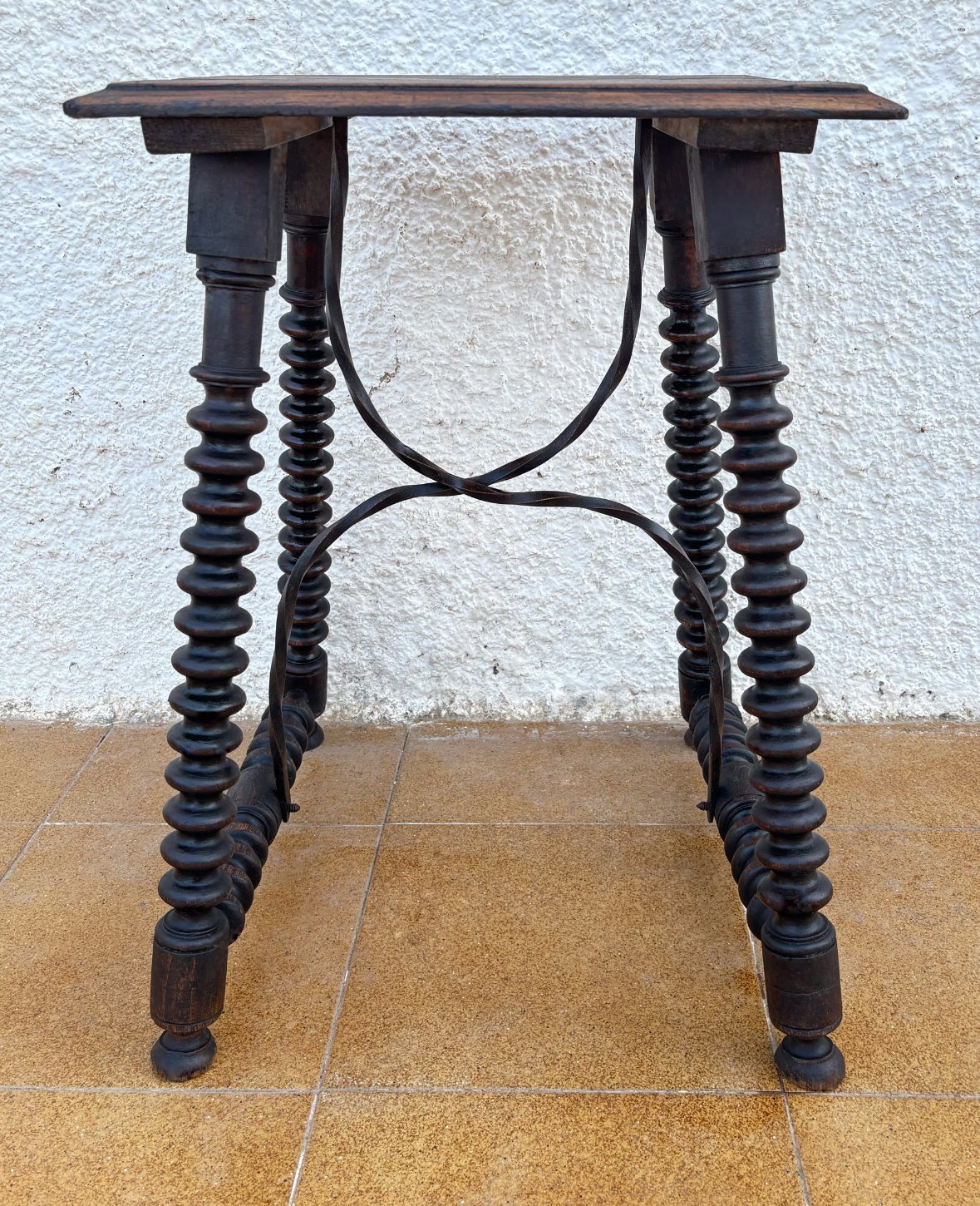 Mesa auxiliar española de principios del siglo XX con elegantes patas y bastidores torneados salomónicos. Tiene una estructura de hierro.