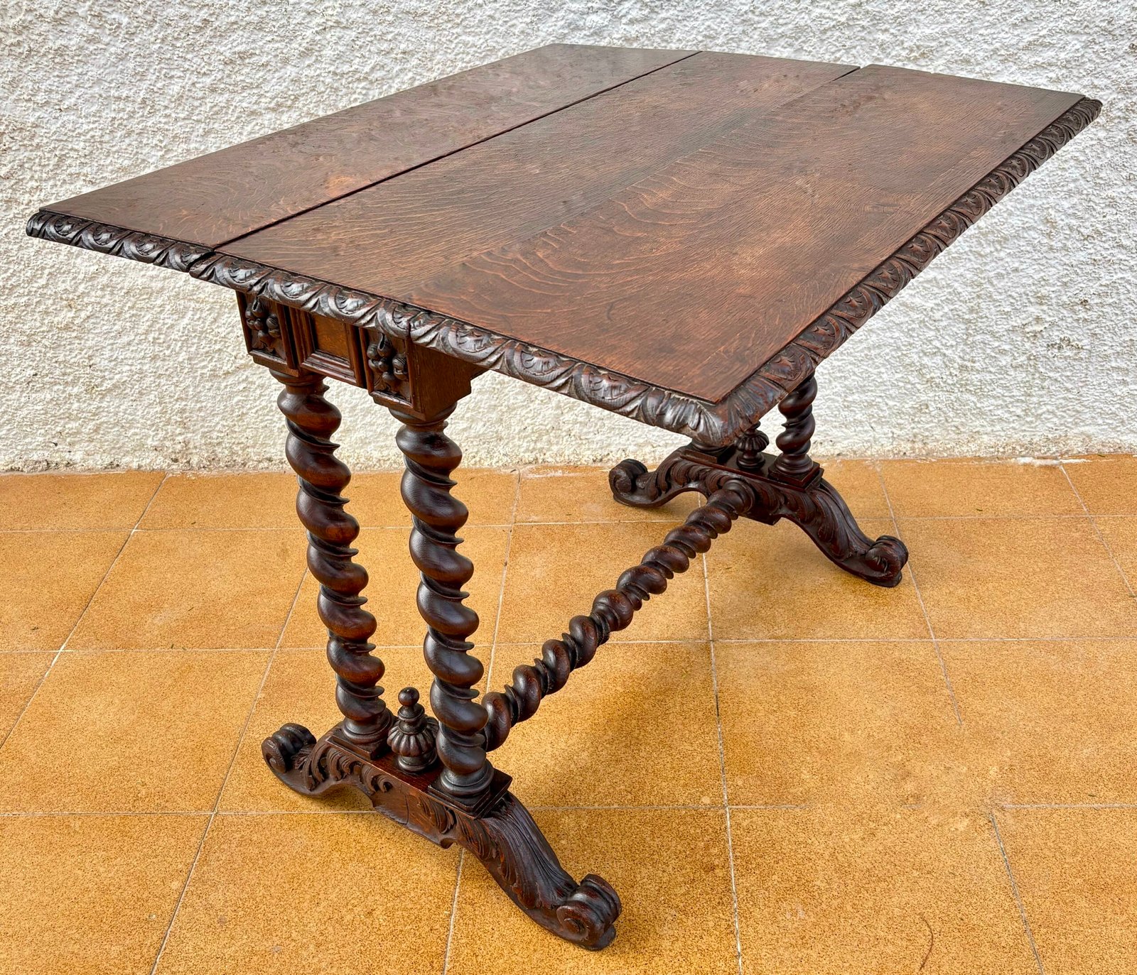 Mesa auxiliar plegable de nogal con patas salomónicas y tablero y cantos tallados. La mesa, abierta, tiene seis patas con travesaños entre ellas para reforzar su estabilidad. Pieza restaurada y muy funcional. Estilo español, barroco.