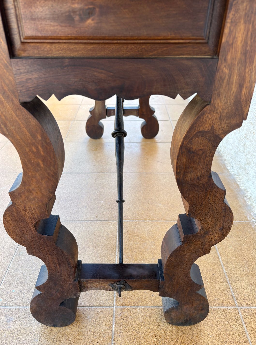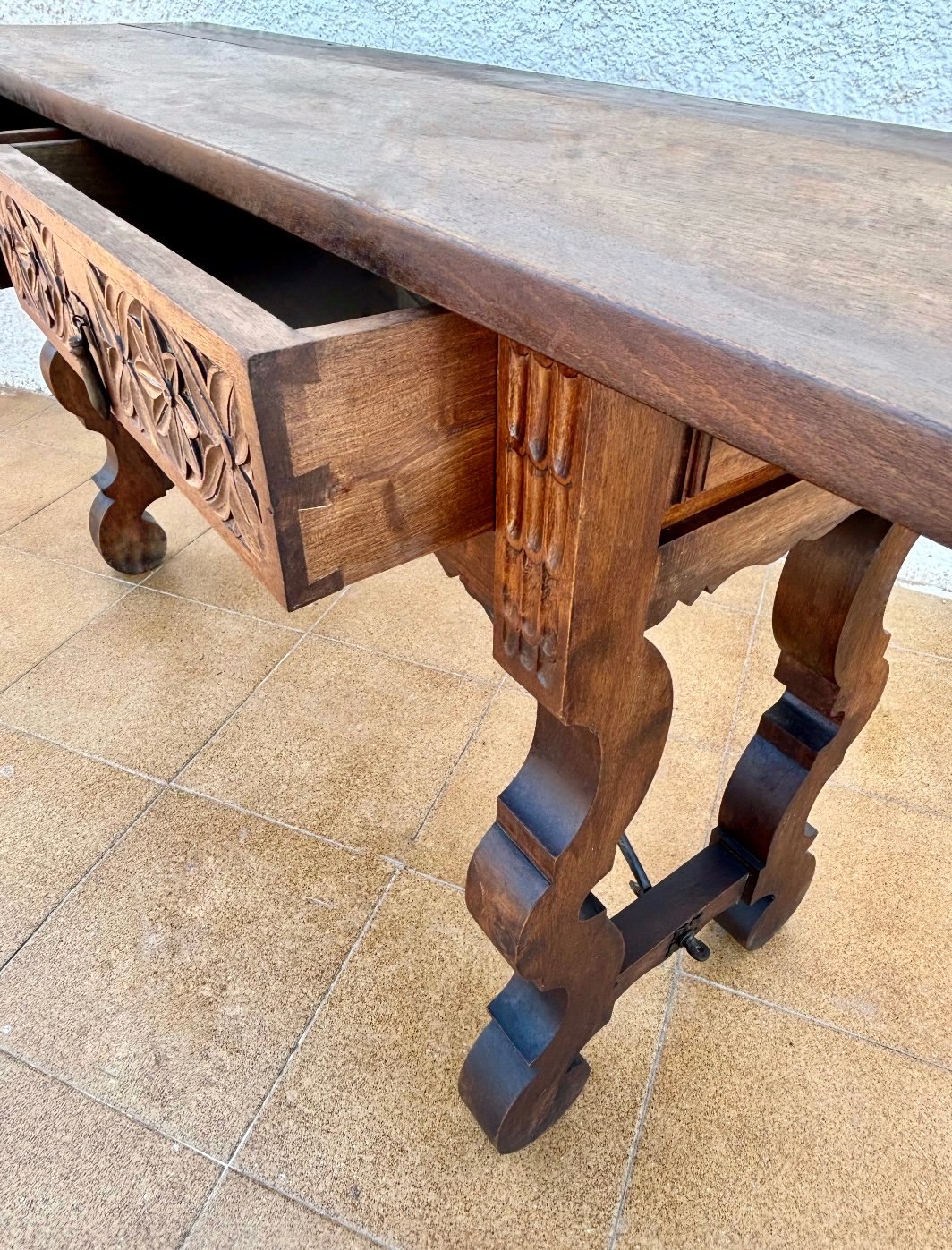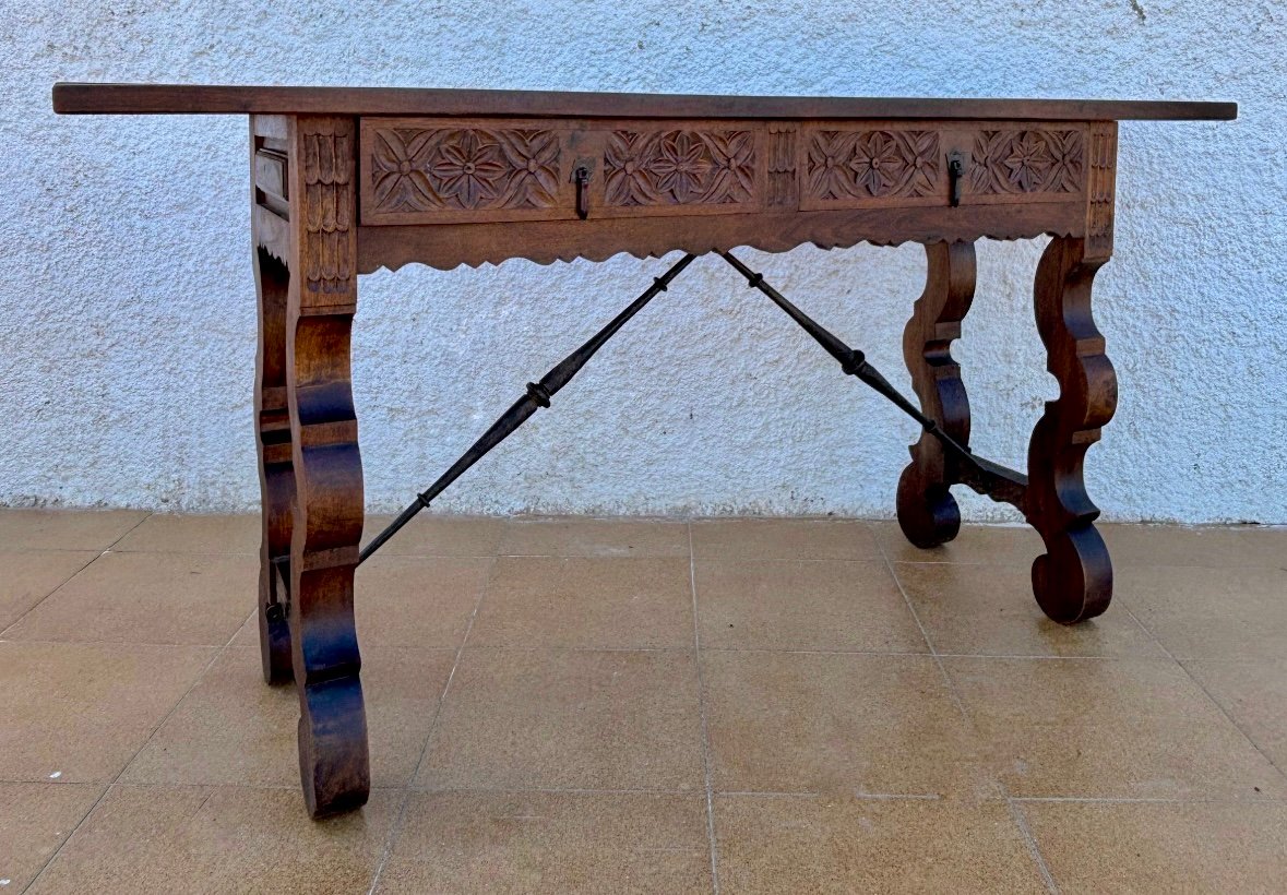 Mesa castellana antigua con patas unidas mediante herrajes de hierro y dos cajones en la cintura. El frente está decorado con elementos vegetales tallados.