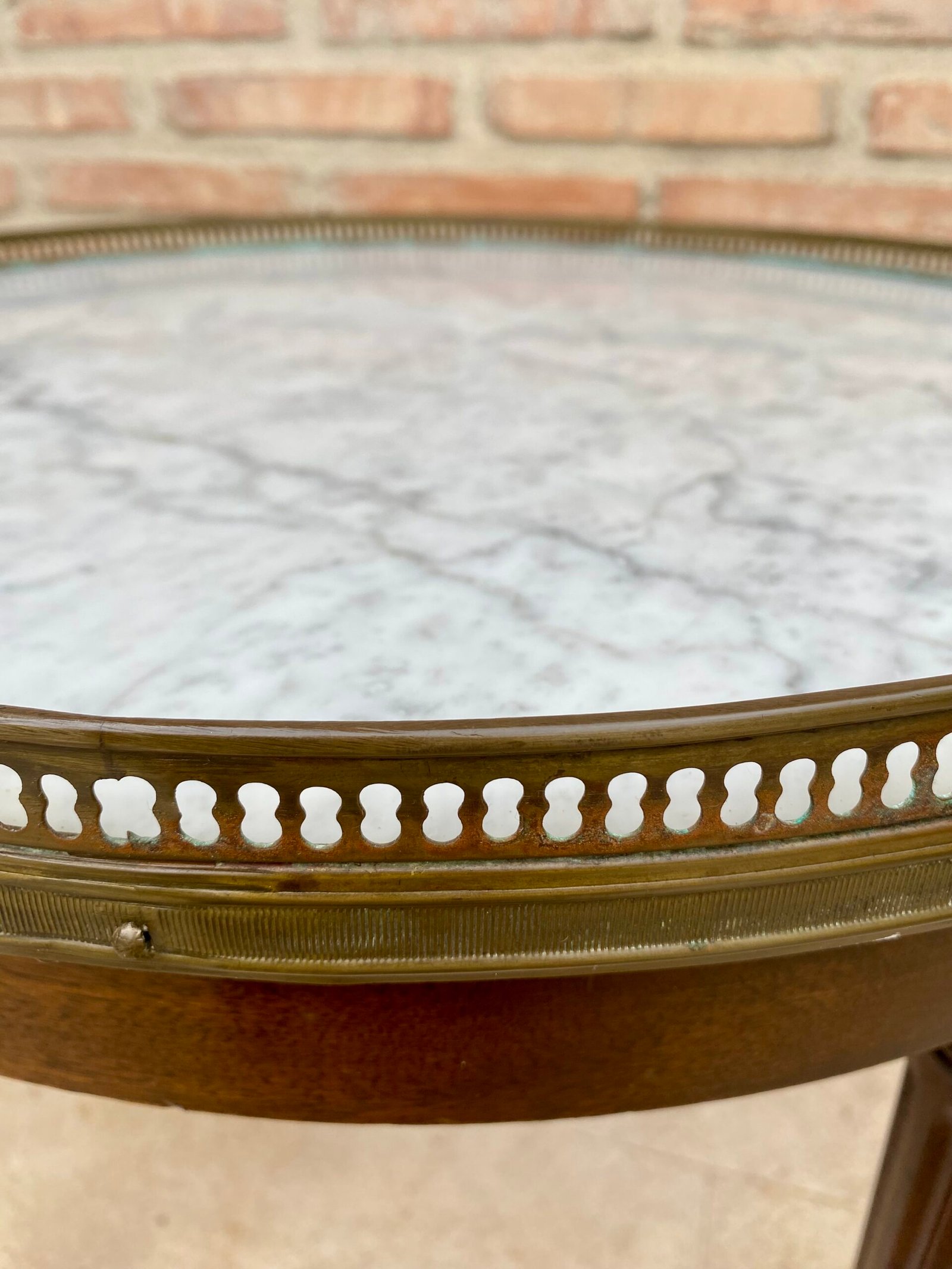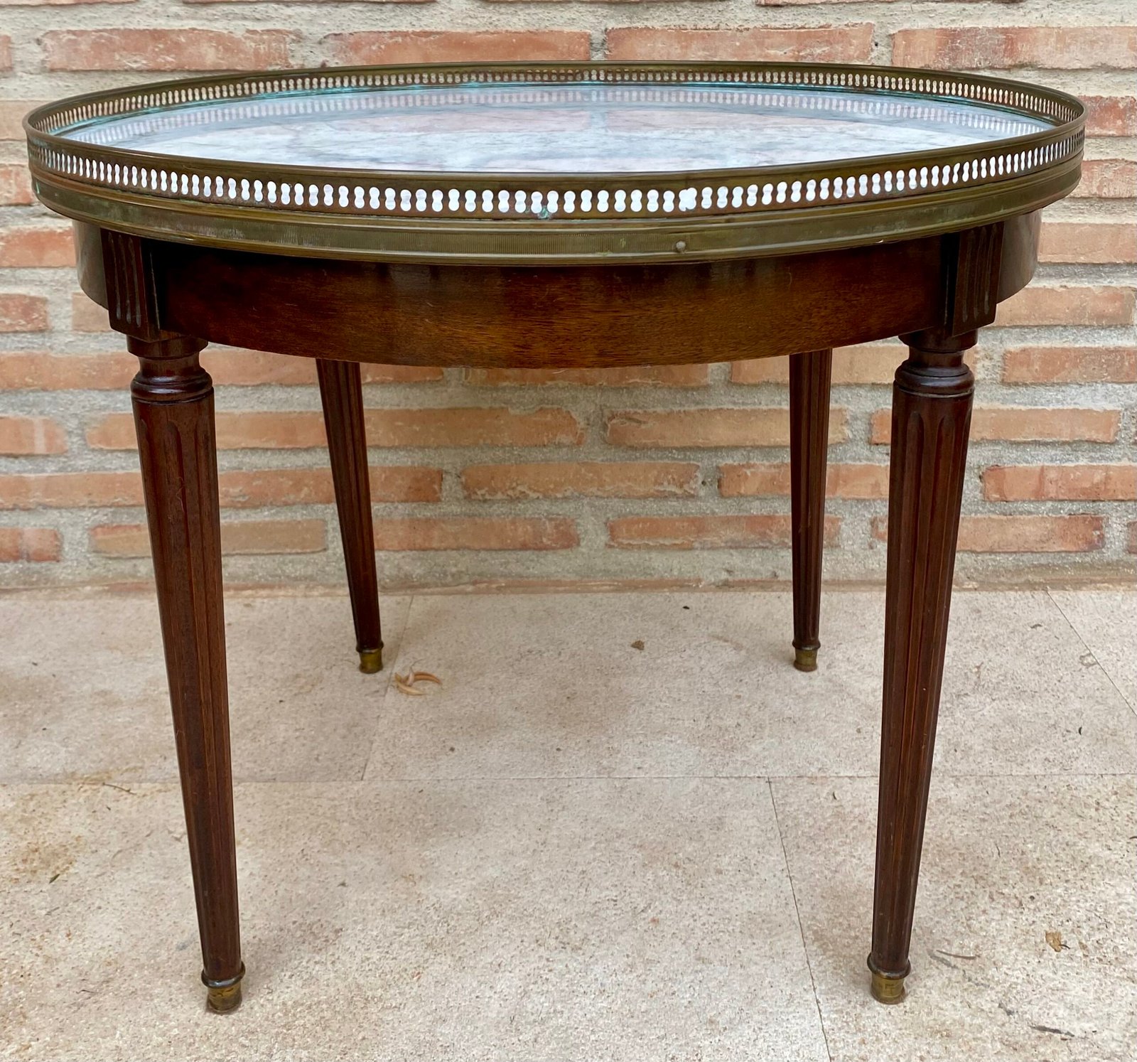 Mesa Bouillotte de estilo Luis XVI en nogal y tablero de mármol, siglo XIX. El tablero circular de mármol blanco jaspeado se encuentra sobre una galería de latón perforado, sobre un friso, y se alza sobre patas circulares acanaladas y cónicas que rematan en tapas de latón.