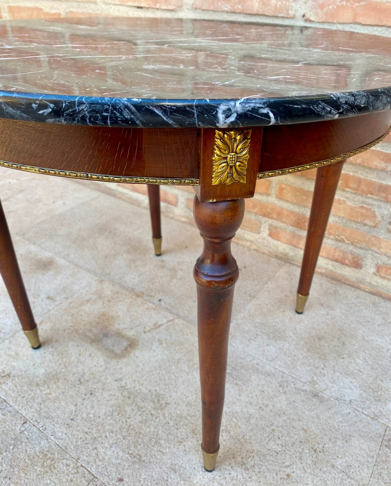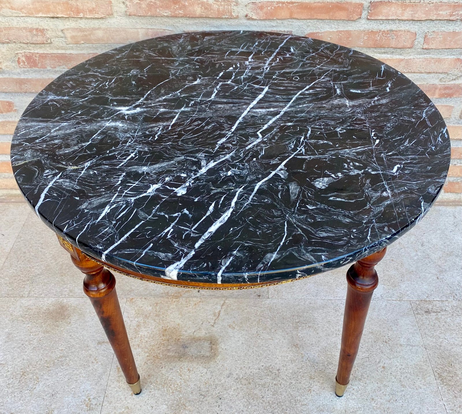 Mesa auxiliar, de centro o de sofá con tablero de mármol negro con vetas blancas. Esta mesa auxiliar de madera de nogal, finamente elaborada, presenta elegantes patas cónicas con una estructura de latón que sostiene un tablero de mármol negro con galería de latón. La mesa se apoya sobre zapatas de bronce.