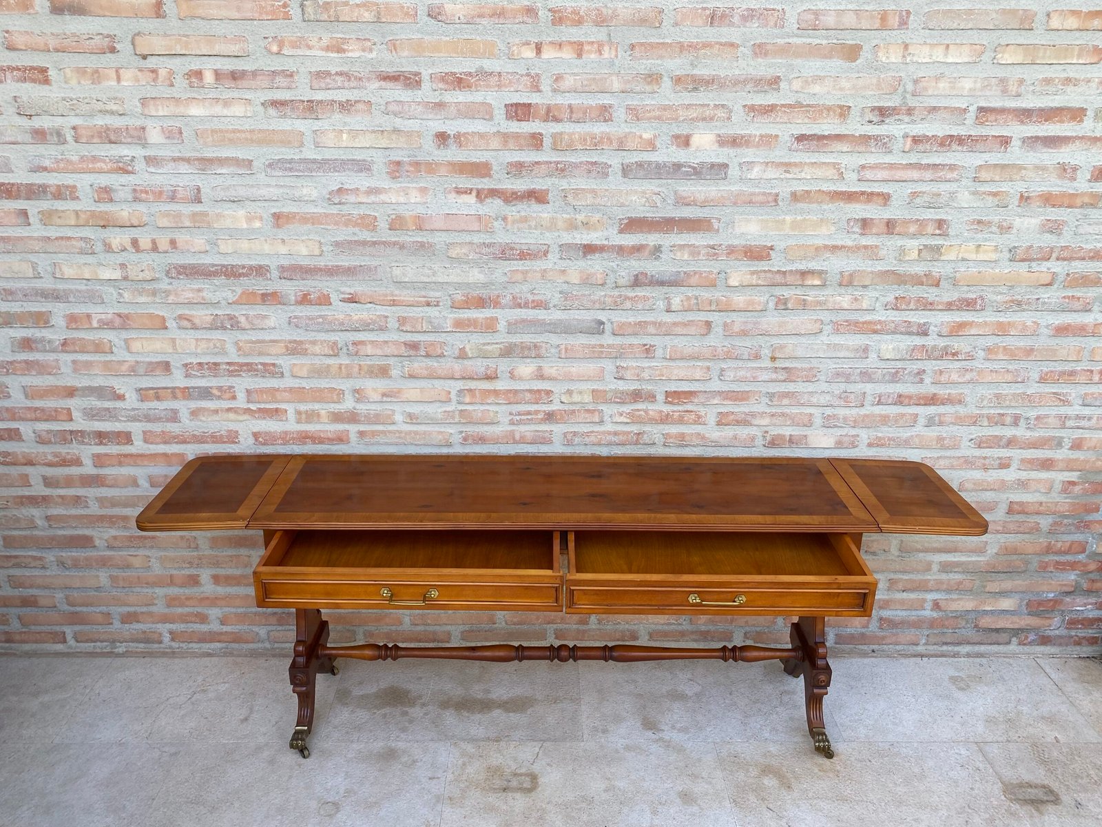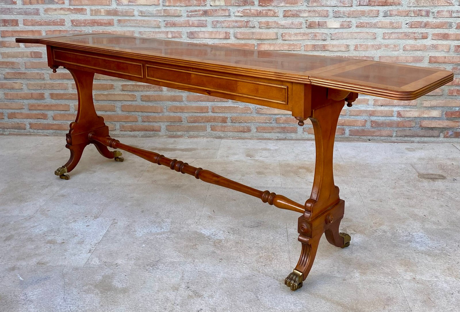 Mesa de comedor convertible moderna de mediados de siglo con patas de garra de bronce y ruedas, década de 1950