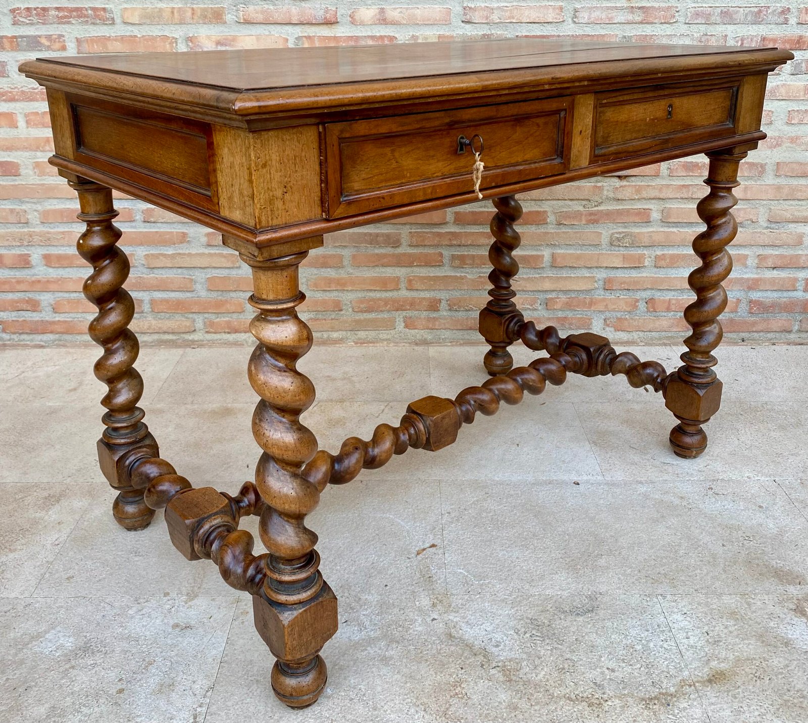 Preciosa librería de nogal que puede usarse como escritorio o mesa de trabajo. Fabricada en robusta madera de nogal. Todas sus patas y bastidor son salomónicos y cuenta con dos cajones con tirador de madera y una sola llave. Es de principios del siglo XIX. Esta hermosa mesa fue rescatada, junto con otras piezas, de una antigua mansión francesa donde Napoleón Bonaparte pernoctó y pasó parte de su vida, la cual adjuntamos en las fotografías.