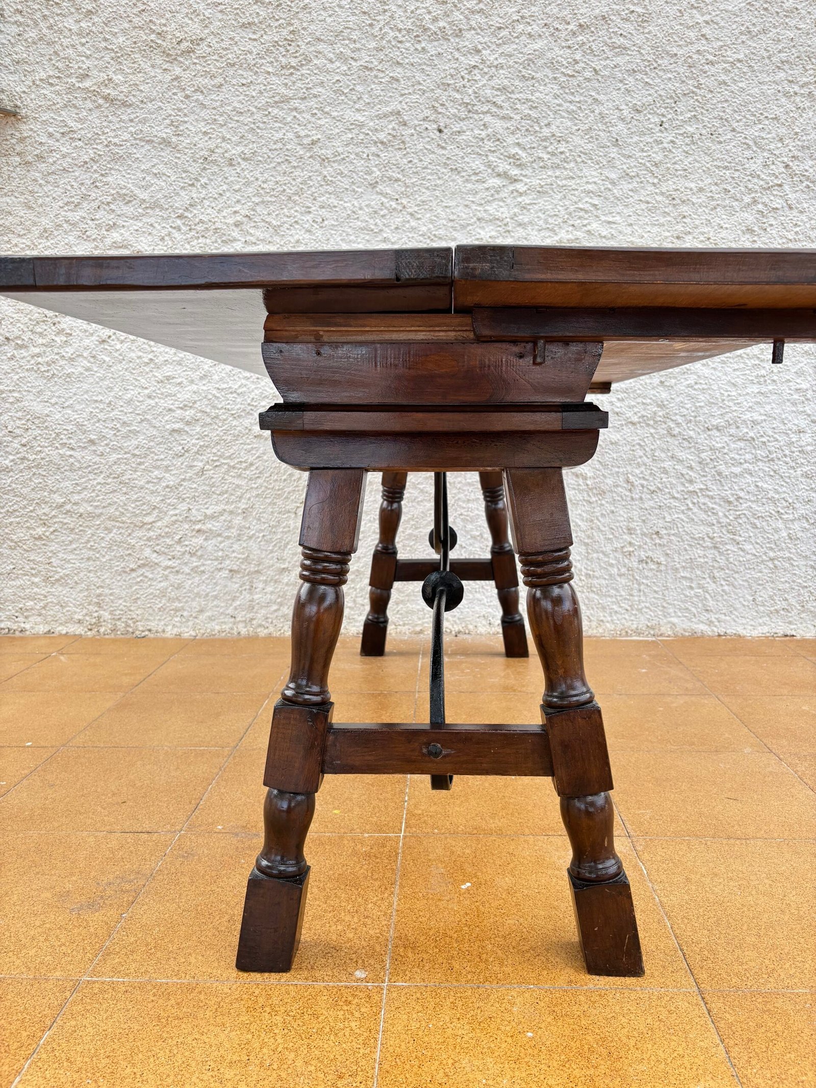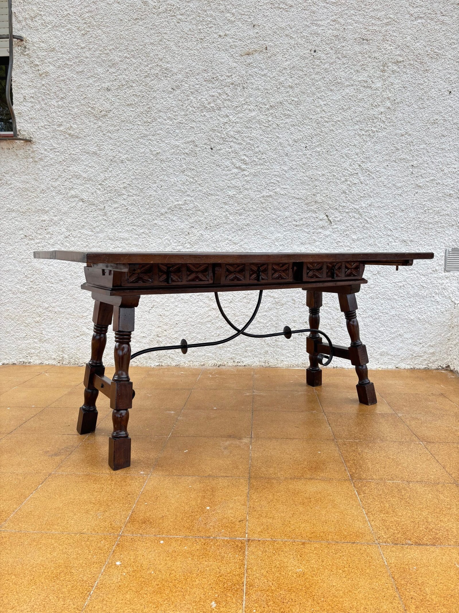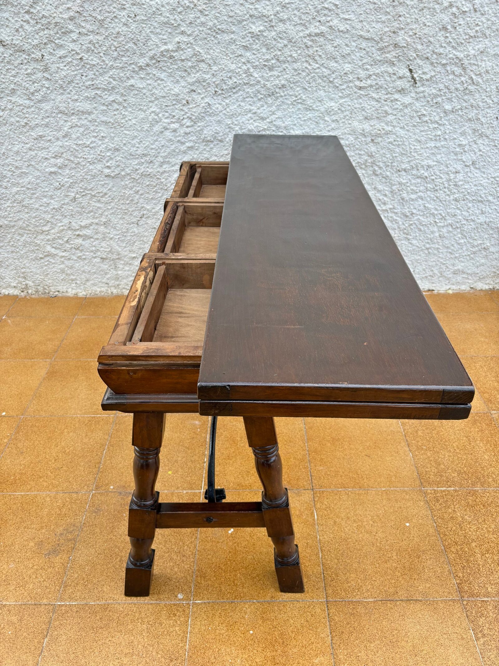 Mesa consola plegable española del siglo XX tallada con camilla de hierro y tres cajones, 1900
