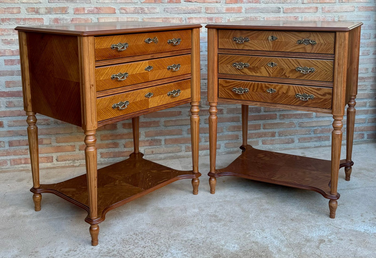 Pareja de mesitas de noche o de noche de finales del siglo XX con tres cajones y estante abierto. Estilo francés.