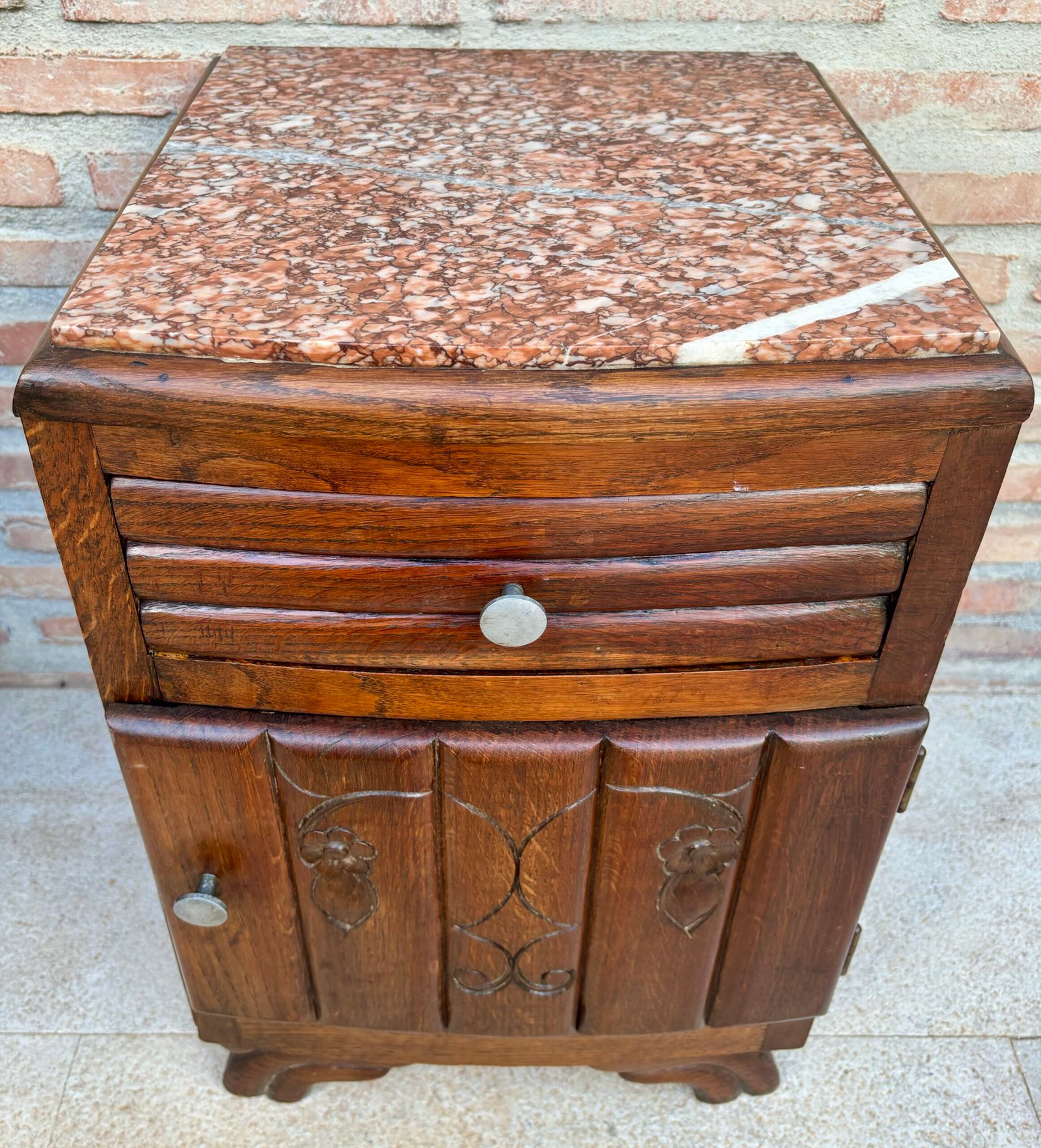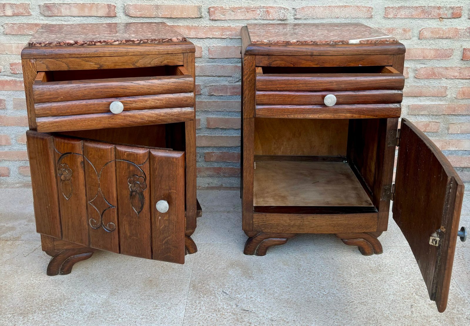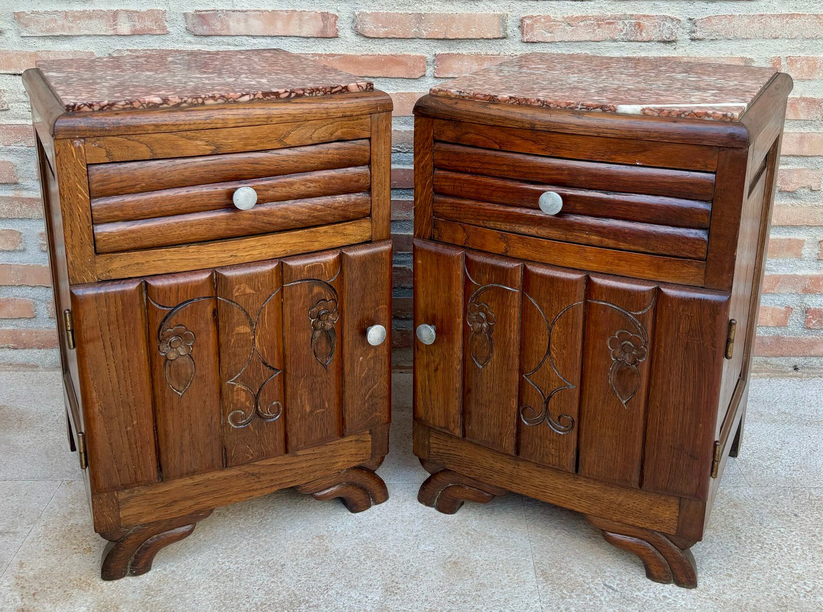 Par de mesitas de noche francesas con tapa de mármol Art Deco o gabinetes de noche, nogal, 1930