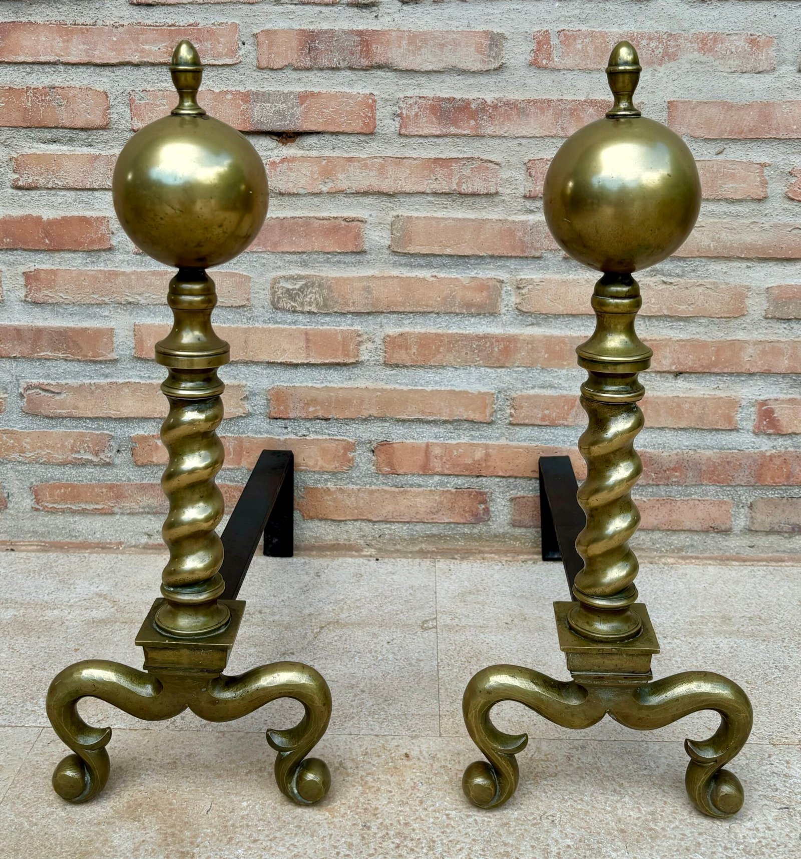 Este elegante par de morillos Chippendale de latón de la época americana temprana presenta múltiples vueltas rematadas con una corona estilo bala de cañón. Las elegantes patas con espuelas terminan en pies tipo zapatilla. Los robustos topes de leño en los morillos evitan que la madera se resbale.