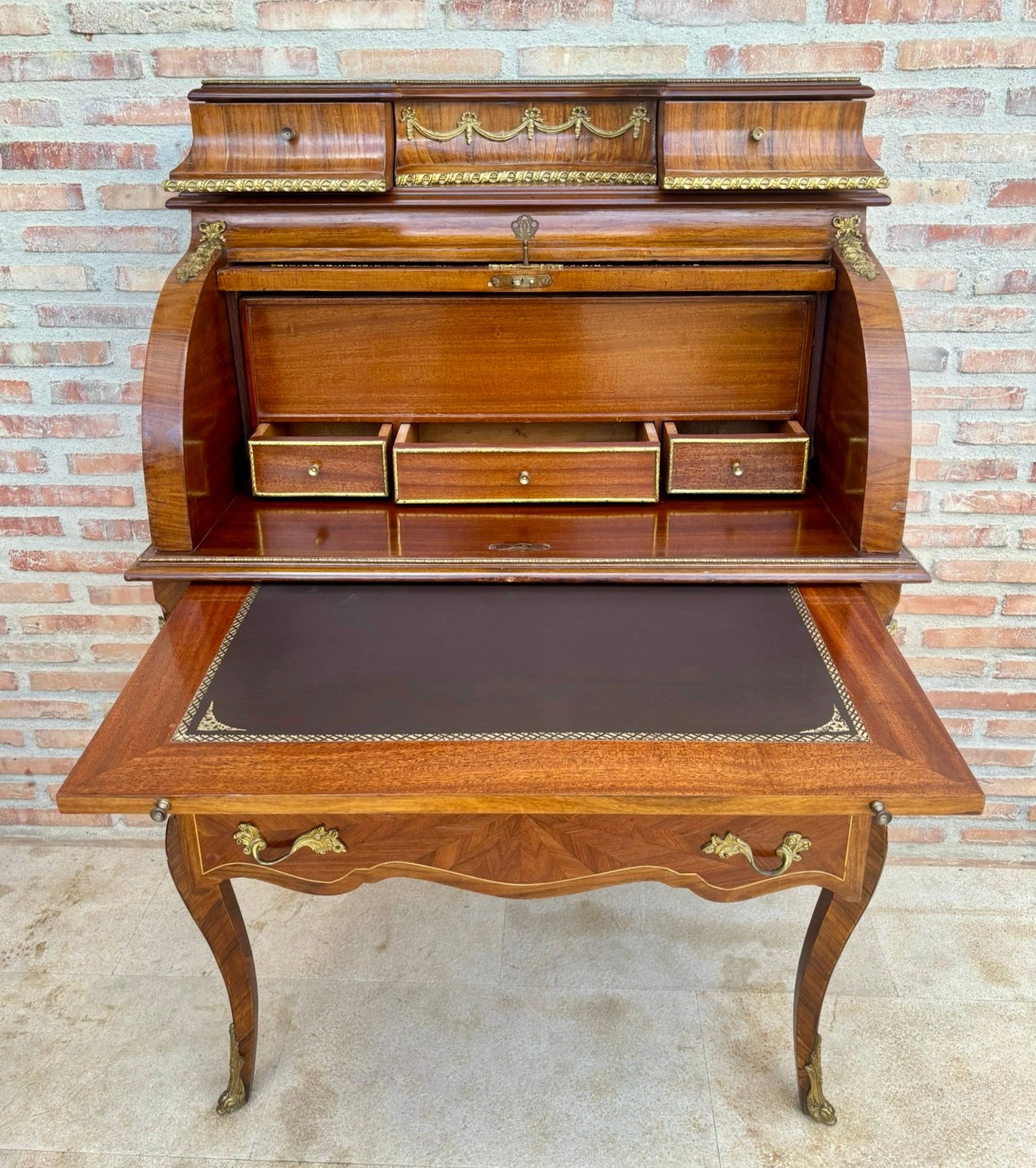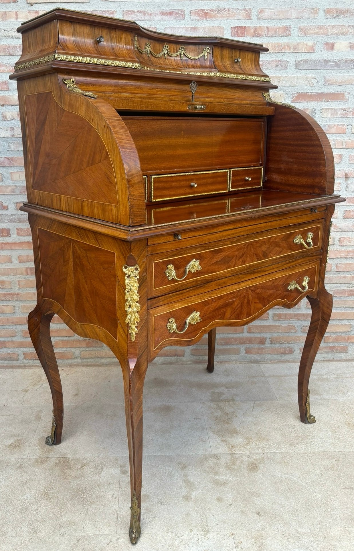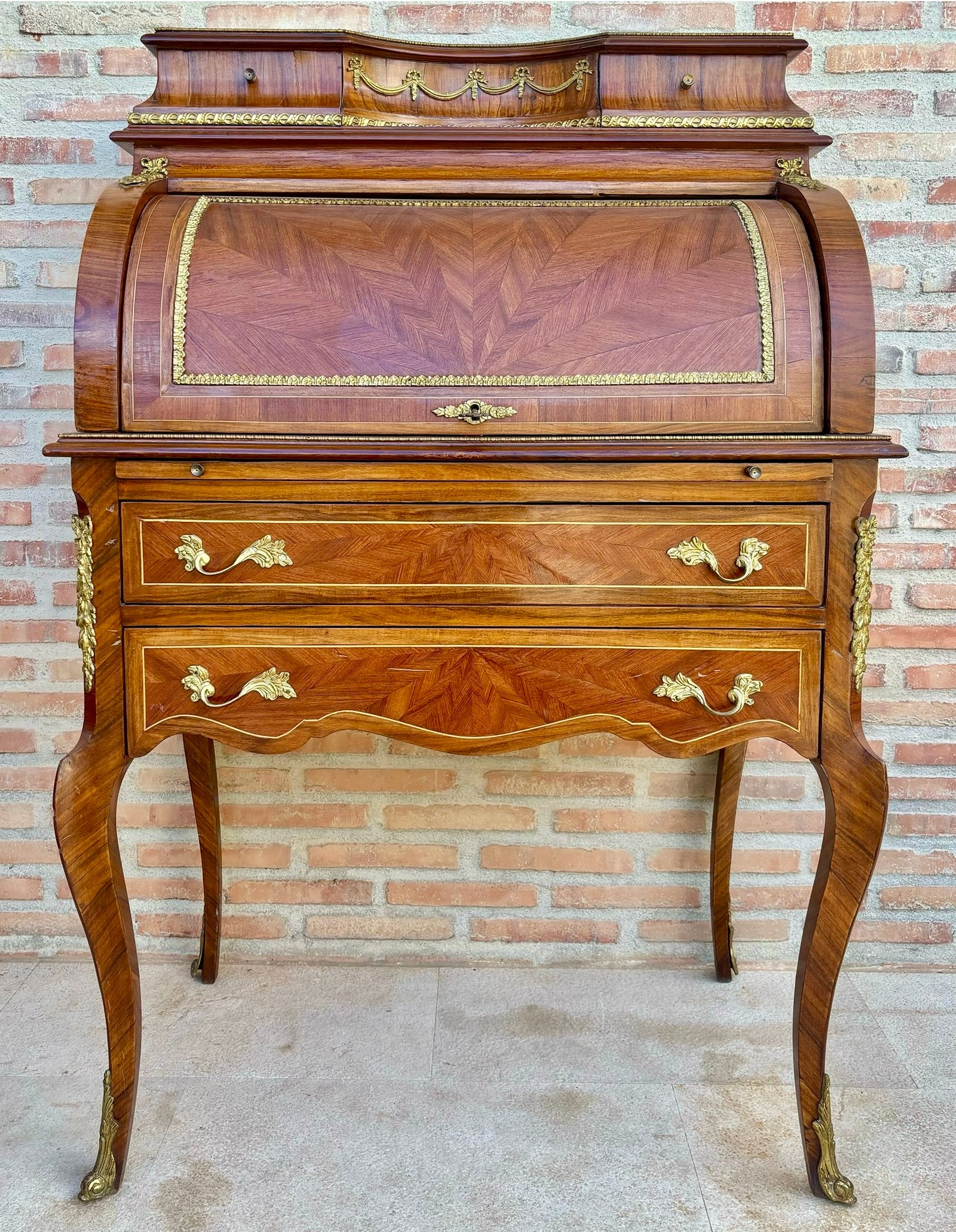 Madera y bronce. Superficie de escritura y compartimentos extraíbles bajo el cierre. Cajón con marco recortado. Galería de latón. Parte trasera chapada. Patas altas y curvadas con monturas y pies de bronce.