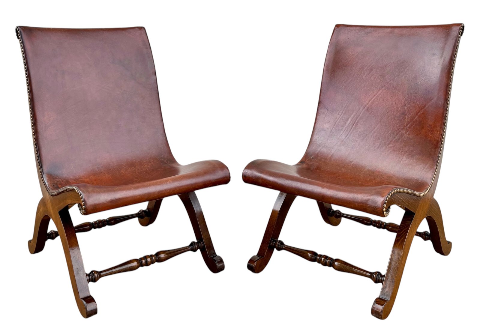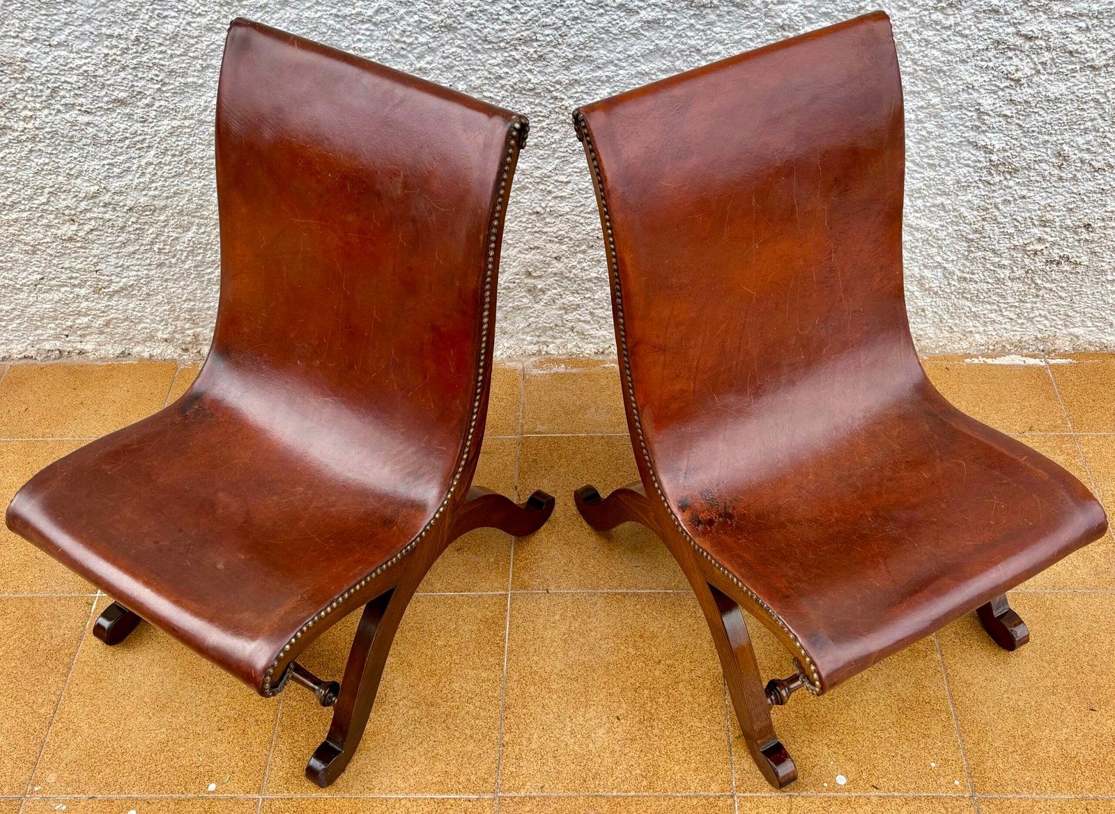 Pareja de sillas auxiliares españolas diseñadas por Pierre Lottier para Valenti, década de 1950. Estructura de madera de roble con líneas curvas y armoniosas sobre la que reposa el respaldo de cuero marrón con tachuelas metálicas. Esta silla se hizo muy popular en España en la década de 1950 gracias al diseño del interiorista francés Pierre Lottier, afincado en Barcelona, para las marcas españolas Valenti, Valmazan y Almazán, quien realizó varias versiones de esta silla y otros asientos y reposapiés del mismo estilo, siempre utilizando madera de roble y cuero como únicos materiales. En la base se puede apreciar el sello Valenti (ver última foto). Bonita pátina.